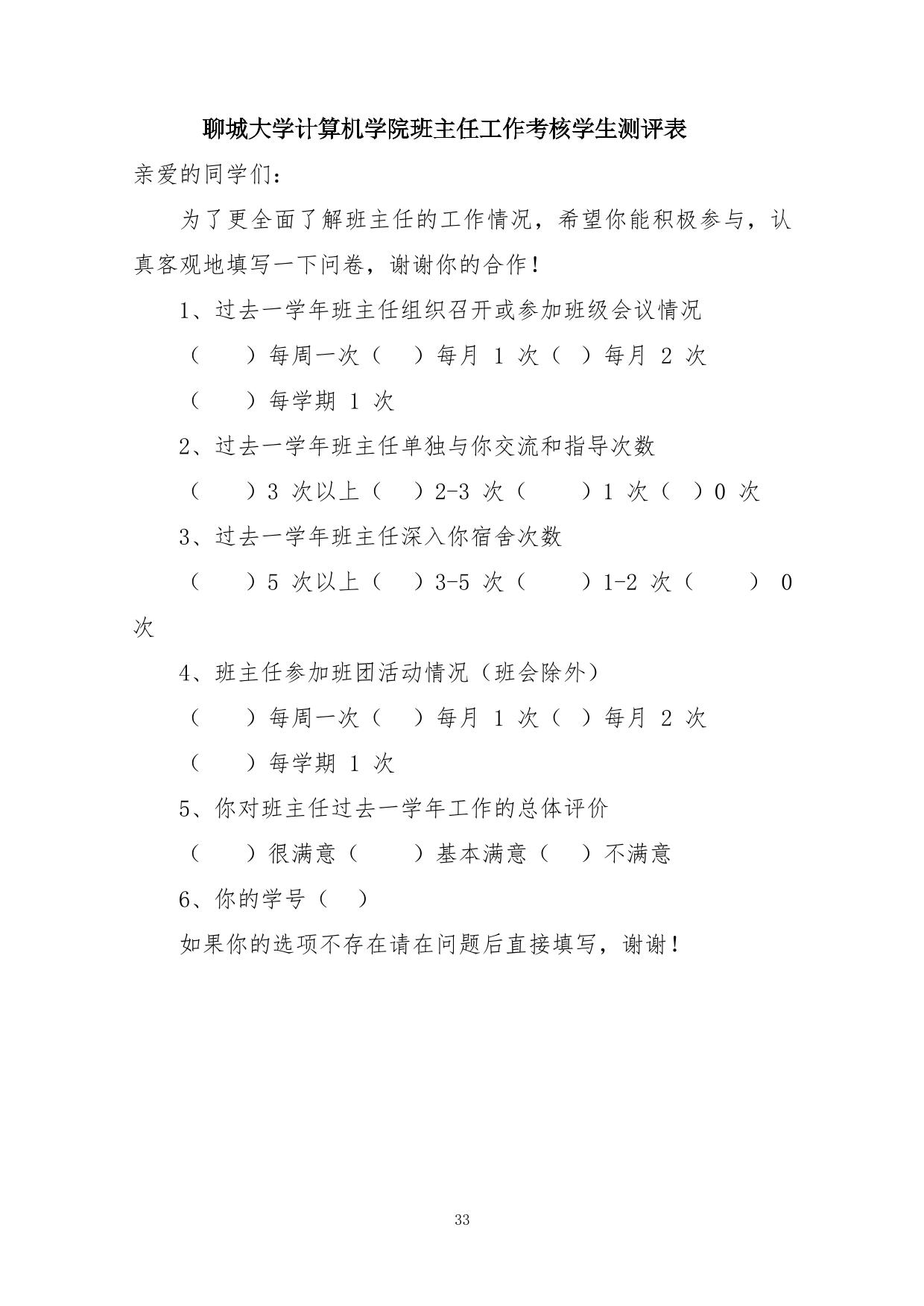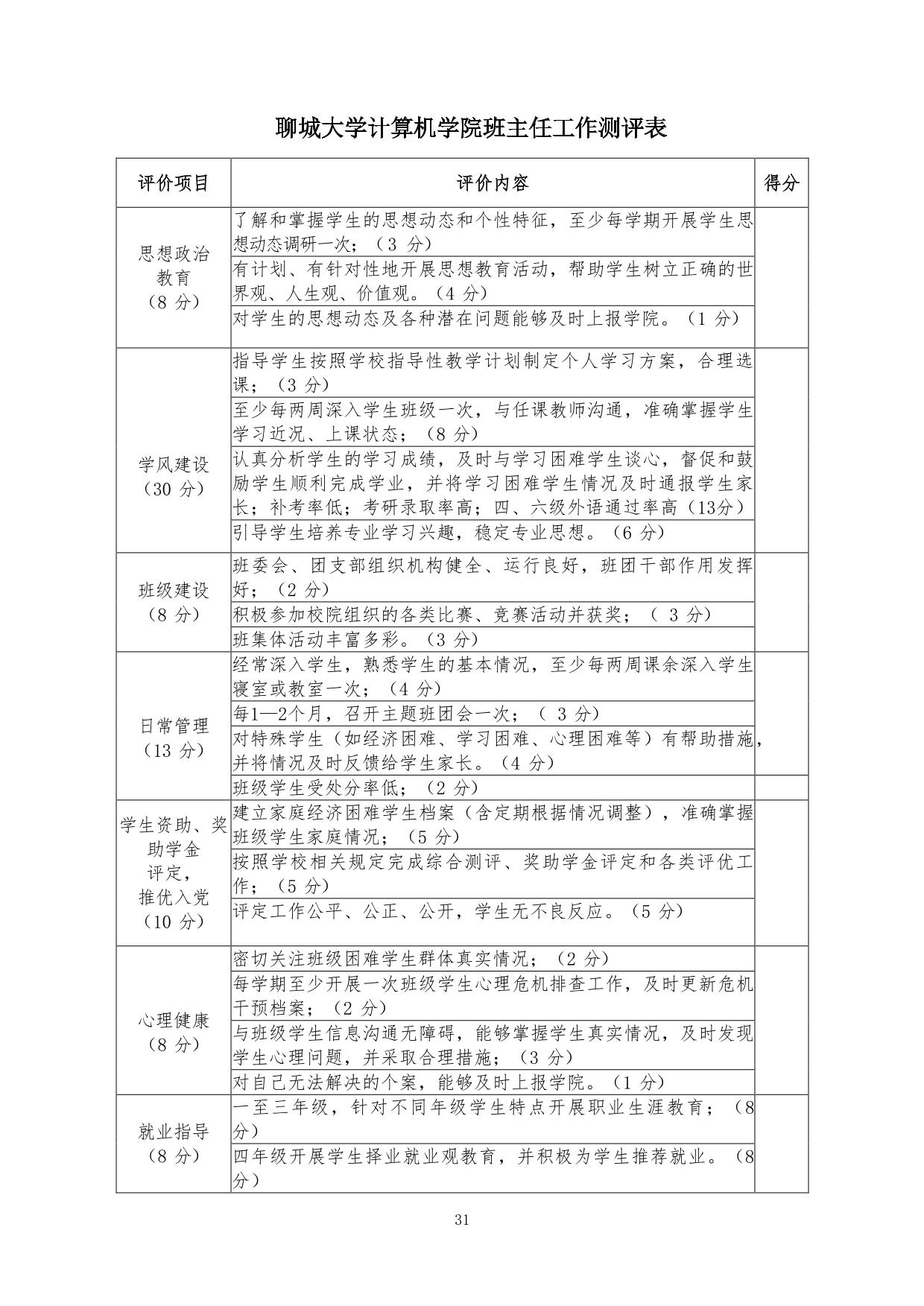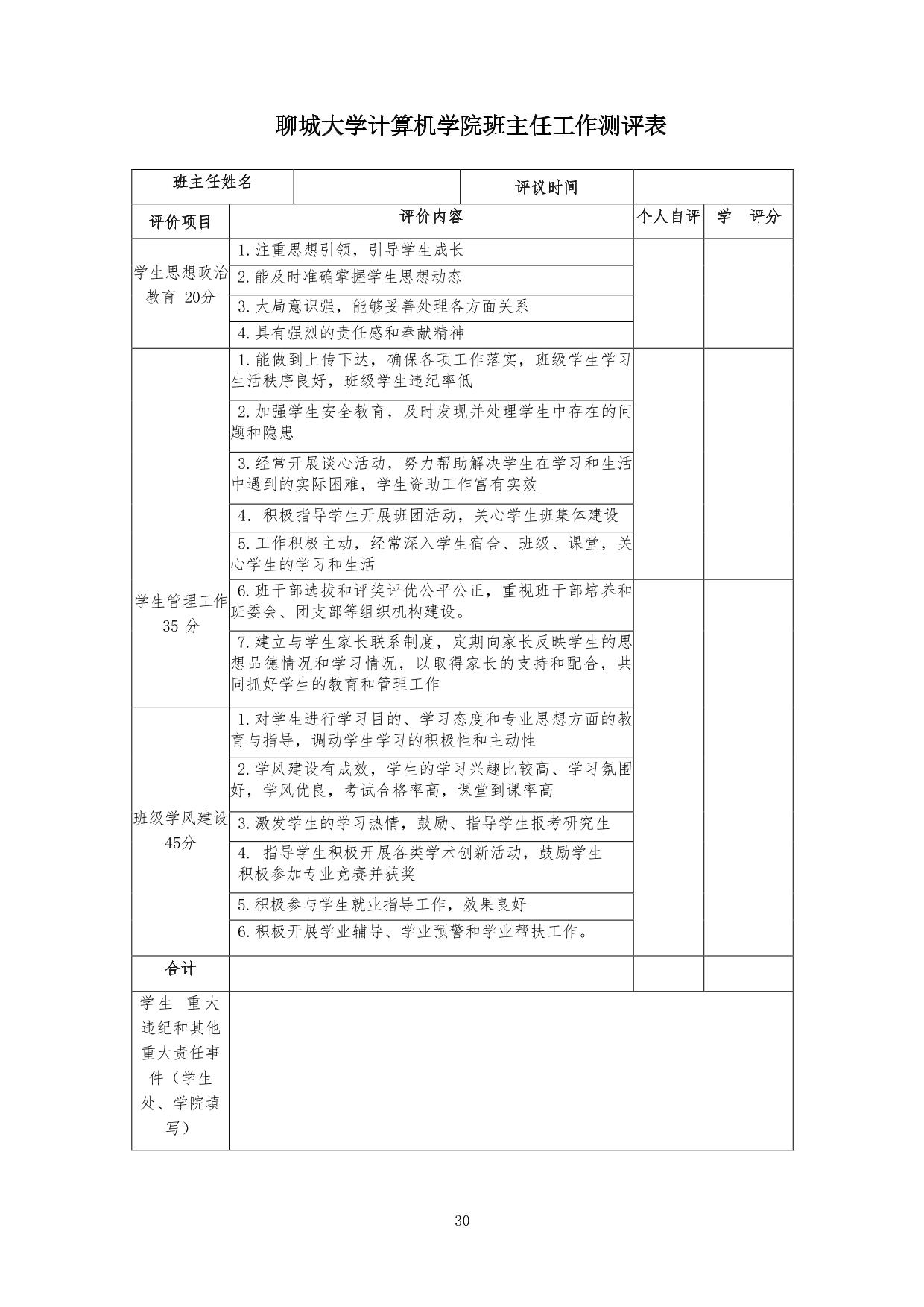 2、班主任工作考核主要根据基础工作和工作实绩情况,从德、能、勤、绩、廉等方面进行综合考核。班主任本人填写《聊城大学计算机学院班主任工作测评表》(见附件),班主任考核工作小组结合《聊城大学班主任工作测评表》和《聊城大学班主任工作考核学生测评表》(见附件)综合评定。
