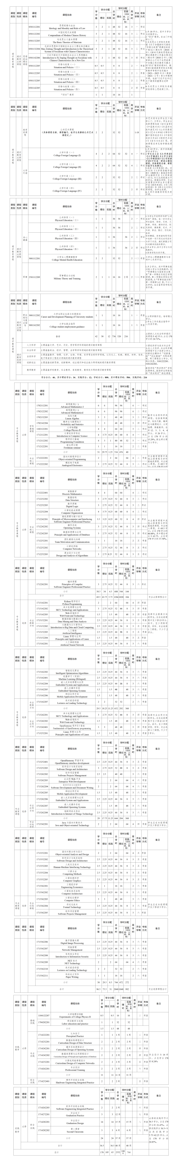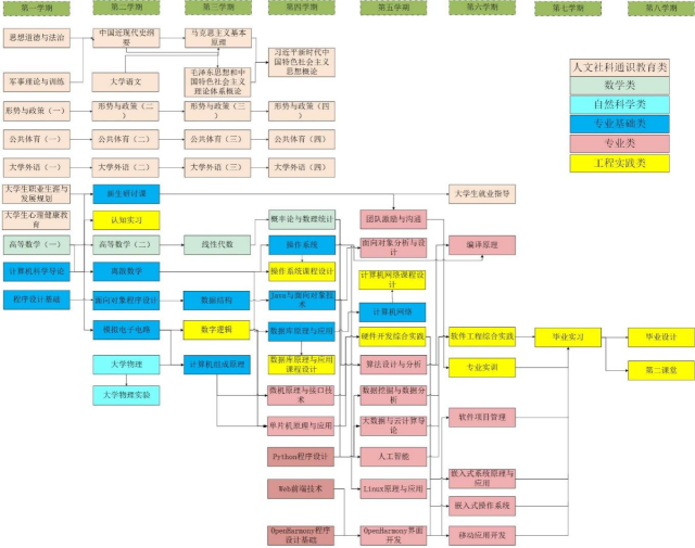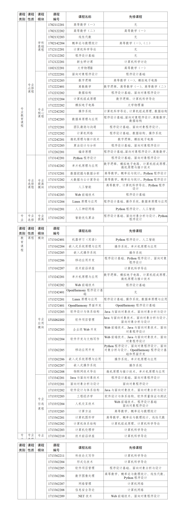 主要课程:高等数学、线性代数、概率论与数理统计、计算机科学导论、程序设计基础、大学物理、面向对象程序设计、新生研讨课、离散数学、计算机组成原理、模拟电子电路、数据结构、操作系统、数据库原理与应用、团队激励与沟通、数字逻辑、微机原理与接口技术、计算机网络、单片机原理及应用、嵌入式系统原理及应用、Python程序设计、机器学习、软件开发综合实践、硬件开发综合实践等。