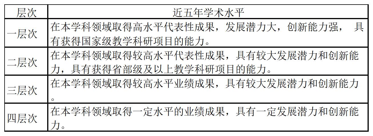 4.第四层次骨干人才:在本学科领域具有一定的学术影响力和学术声誉,在科学研究方面已取得较突出学术成果的省部级人才工程青年项目入选者;或相当水平优秀人才。
