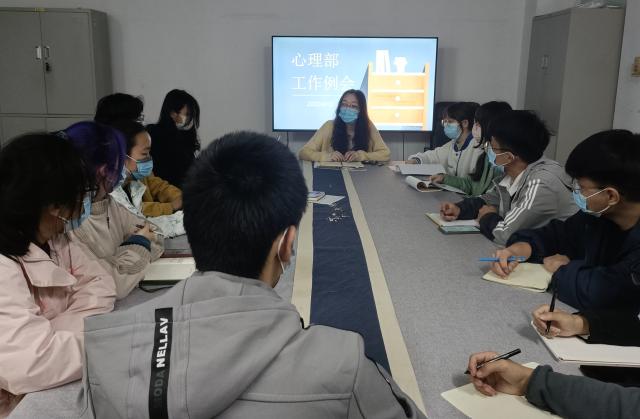 会议中,李佳雯首先对心理部心理健康工作的开展情况给予了充分的肯定,对成员工作时的积极态度进行了表扬,接着围绕重点工作内容提出了建设性的意见,对下一步工作的展开进行了具体的规划。心理部成员们认真听讲,记录重要内容,积极发言。李佳雯还在会中讲到心理咨询方面的基本知识,并着重说明了心理部的岗位职责,指出作为心理部的成员,首先要提高自身素质,拥有互助的意识与能力,才能更好地服务同学,平时工作中应贴近同学们的生活,细心观察自班同学表现,及时发现问题,向老师汇报,严格遵守保密的原则。心理部副部针对心理健康月特色活动进行了具体的工作安排,根据实际情况对本部的工作内容进行了汇报,心理部成员就心理部工作分享了自己的思考和想法。最后,李佳雯要求心理部成员要积极调动各班心理委员向老师提出有关于心理健康发展的想法,积极开展有关活动,帮助同学们树立健康乐观的心态。
