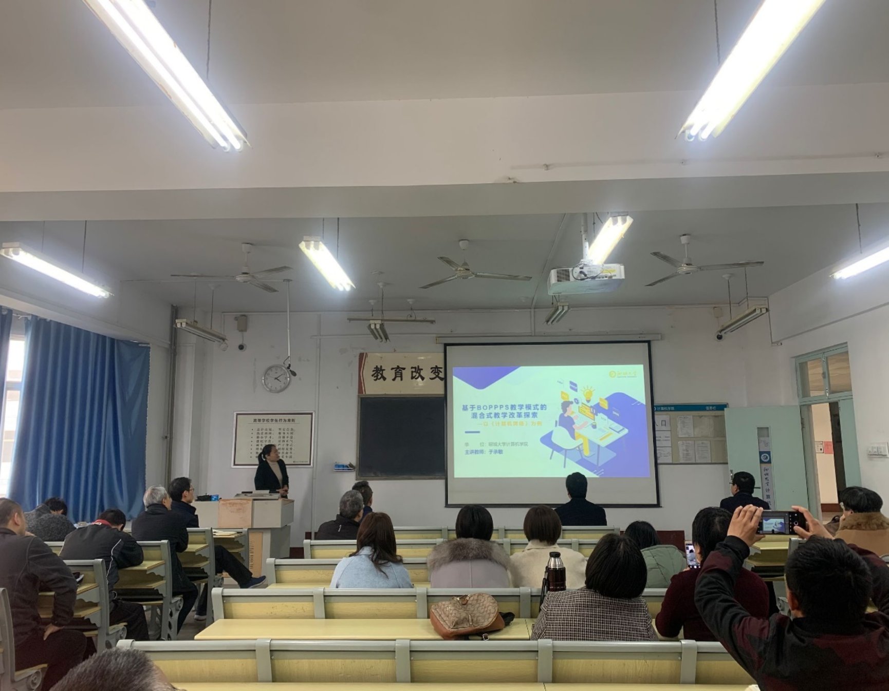 为促进教师间教学经验的交流,学院召开混合式教学改革研讨推进会。3月18日,在我院的全体教工会上,邀请于承敏副教授进行了一次关于混合式教学改革的讲座。于承敏,计算机学院副教授,在2021年度聊城大学教学创新大赛中获得一等奖。本次讲座的主题是基于BOPPPS模式的混合式教学改革探索。