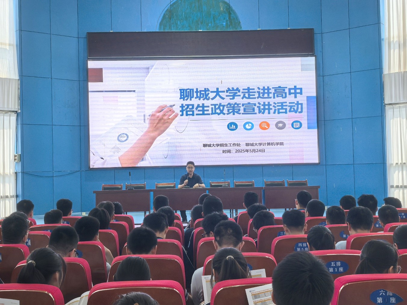 在活动现场,郑万啸向陵城一中学生及教师详细介绍了聊城大学建校历史、办学理念和学科特色,并着重阐述了计算机学院各个专业的培养目标、主要课程以及发展前景等信息,结合翔实的过往数据,全方面地展示出聊城大学计算机学院取得的成绩。同时,郑万啸为学生重点解读了聊城大学的招生政策,包括地方专项计划与公费师范生计划,以便他们对学校的招生工作有更全面深刻的了解。