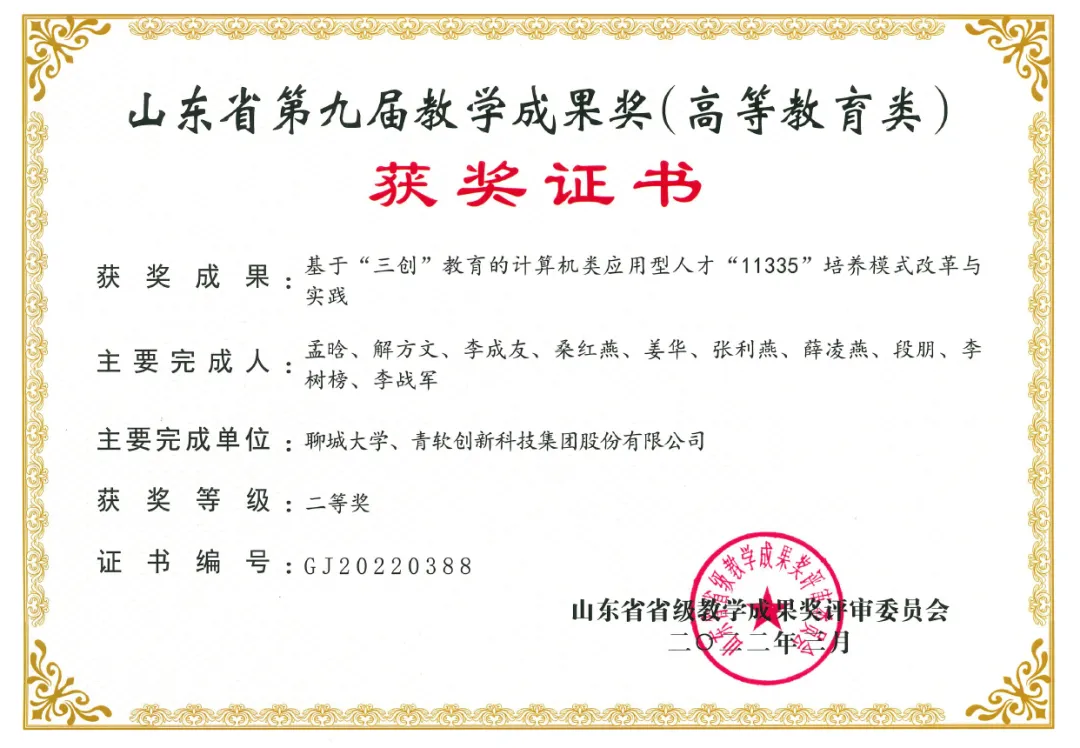 2021年获评山东省一流专业建设点;为山东省教育厅、财政厅高水平应用型重点建设专业群专业;为聊城大学鼓励性发展(A类)专业;拥有山东省一流本科课程三门;近三年,专业学生在国家、省级专业比赛中取得优异成绩,获得国家及省级以上奖励近600人次;专业教师多人次在省、校级教学比赛中荣获一、二等奖。